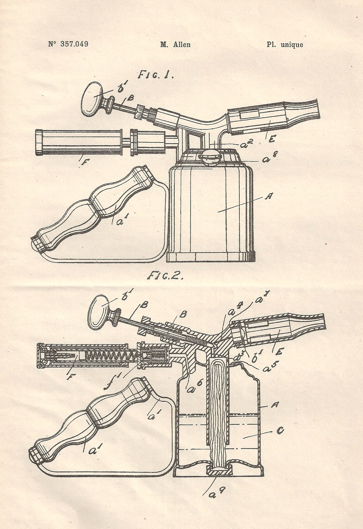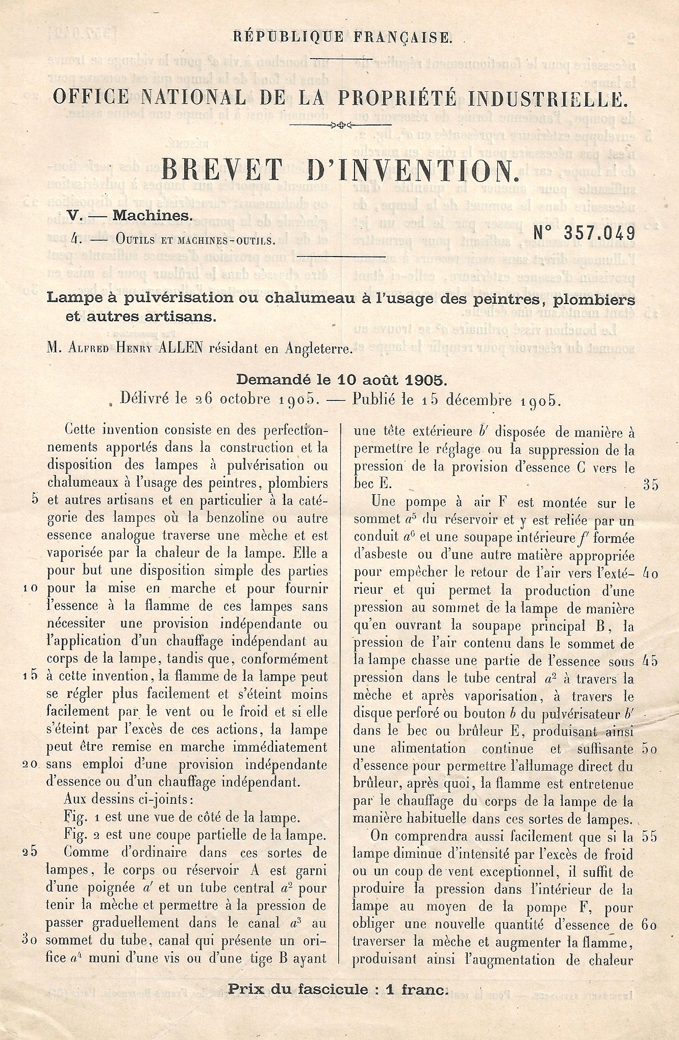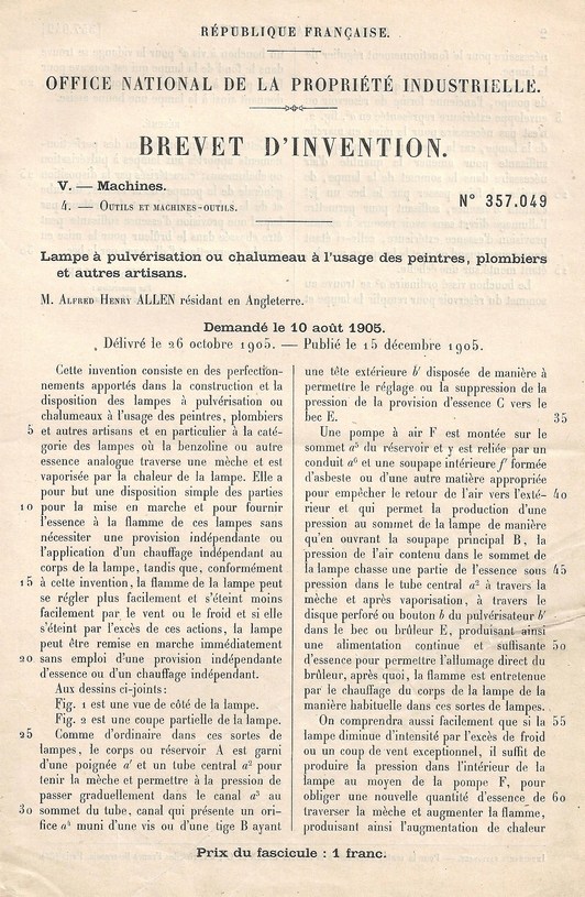 A H Allen~ French Patent No 357,049 (p1) (click on to enlarge) |